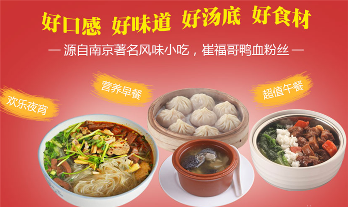 崔福哥鸭血粉丝隶属于北京崔福哥鸭血粉丝餐饮管理有限公司,北京崔福哥鸭血粉丝餐饮管理有限公司崔福哥鸭血粉丝是南京有名的风味小吃,由鸭血、鸭肠、鸭肝等加入鸭汤和粉丝制成。口感鲜香,爽口宜人。鸭肉蛋白质含量高,脂肪含量低,特别适合老年人食用。