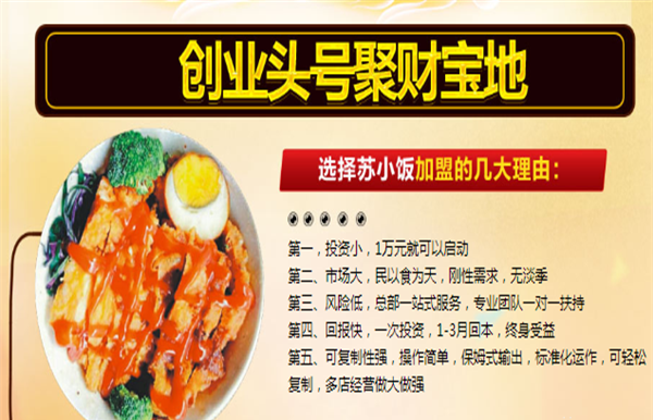 苏小饭烤肉拌饭流水线标准化生产,无需大厨,无需经验。苏小饭烤肉拌饭多种系列覆盖市场,好吃、新鲜,价格绝对优势,西式化的管理,中国人的口味,年轻人的喜爱。苏小饭烤肉拌饭经营灵活,开店、外卖、订餐,团购,形式多种多样,只要用心做,赚钱那还不轻松。