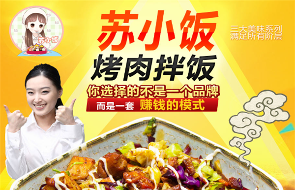 苏小饭烤肉拌饭隶属于四川苏小饭餐饮管理有限公司,旗下有四大项目烤肉系列、脆皮鸡饭、无厨系列、特色双拼。苏小饭公司现有直营店12家,全国各地一百多家。苏小饭烤肉拌饭三大美味系列,满足所有阶层,价格合理,美味健康。